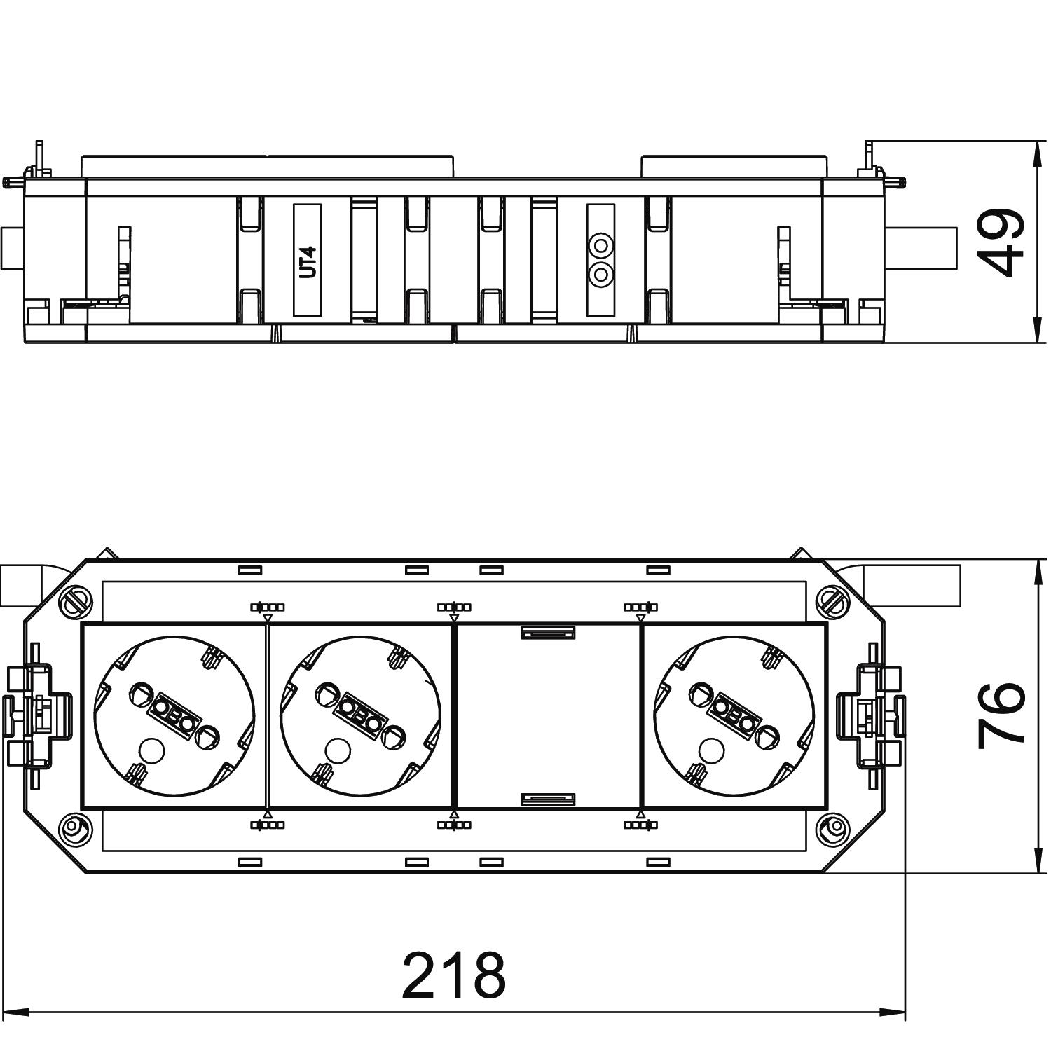 Укомплектованная монтажная коробка UTC4 оснащен 2 розетками 33 с защитным контактом оранжевого цвета, одной розеткой 33° с защитным контактом мятно-зеленого цвета и заглушкой для последующей установки устройств серии Modul45 или Modul 45connect, 250 В~16 A.
