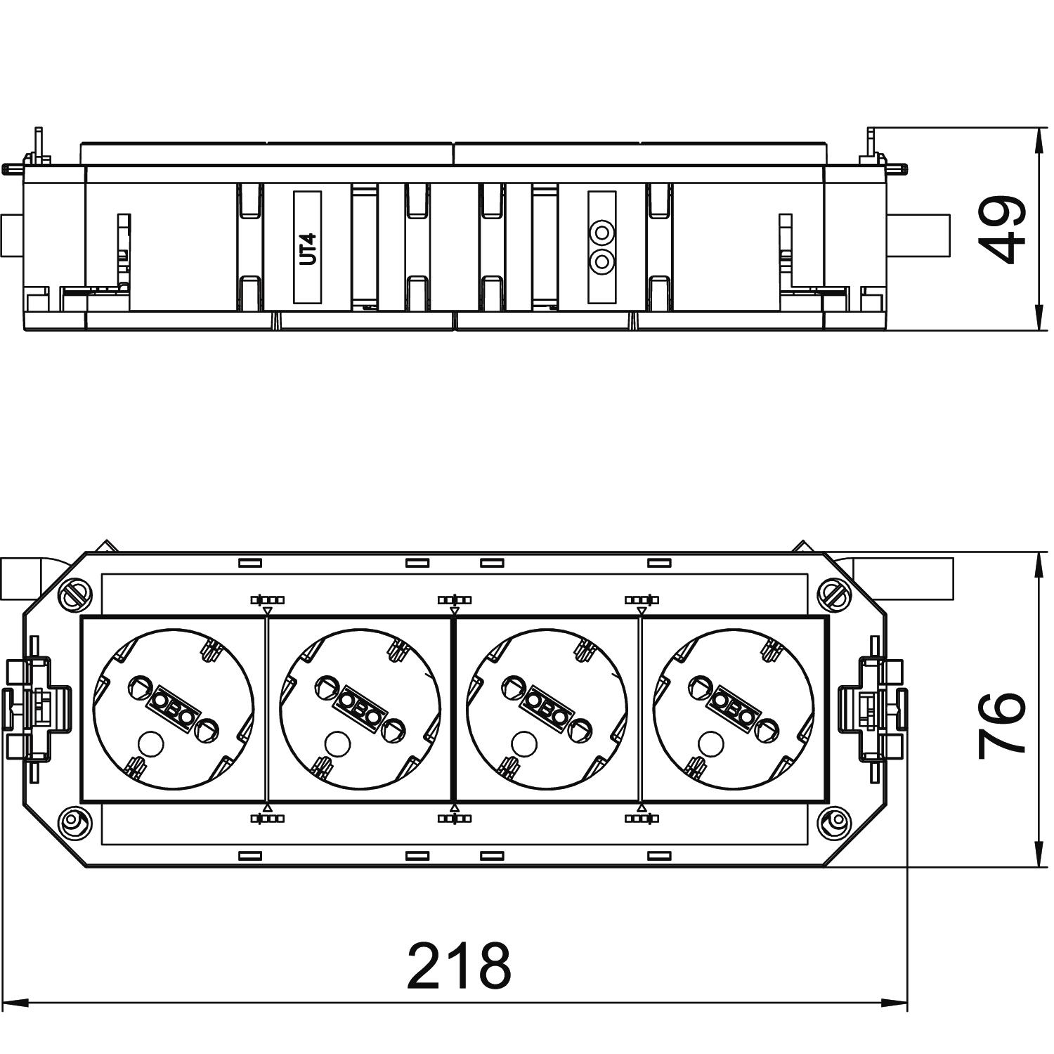 Укомплектованная монтажная коробка UTC4 оснащена 3 розетками 33° с защитным контактом белого цвета и одной розеткой 33° с защитным контактом оранжевого цвета, 250 В~ 16 A. С соединительным проводом без содержания галогенов.