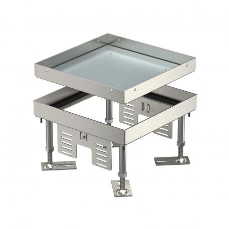Регулируемая кассетная рамка, глухая, класс нагрузки от 1 до 10 кН, 2-х секционная. Могут быть установлены 2 накладки APMT2. Можно установить до 6 электроустановочных изделий размером 45х45 мм серии Modul45 с помощью 2 коробок UT3 (арт. 7408723).