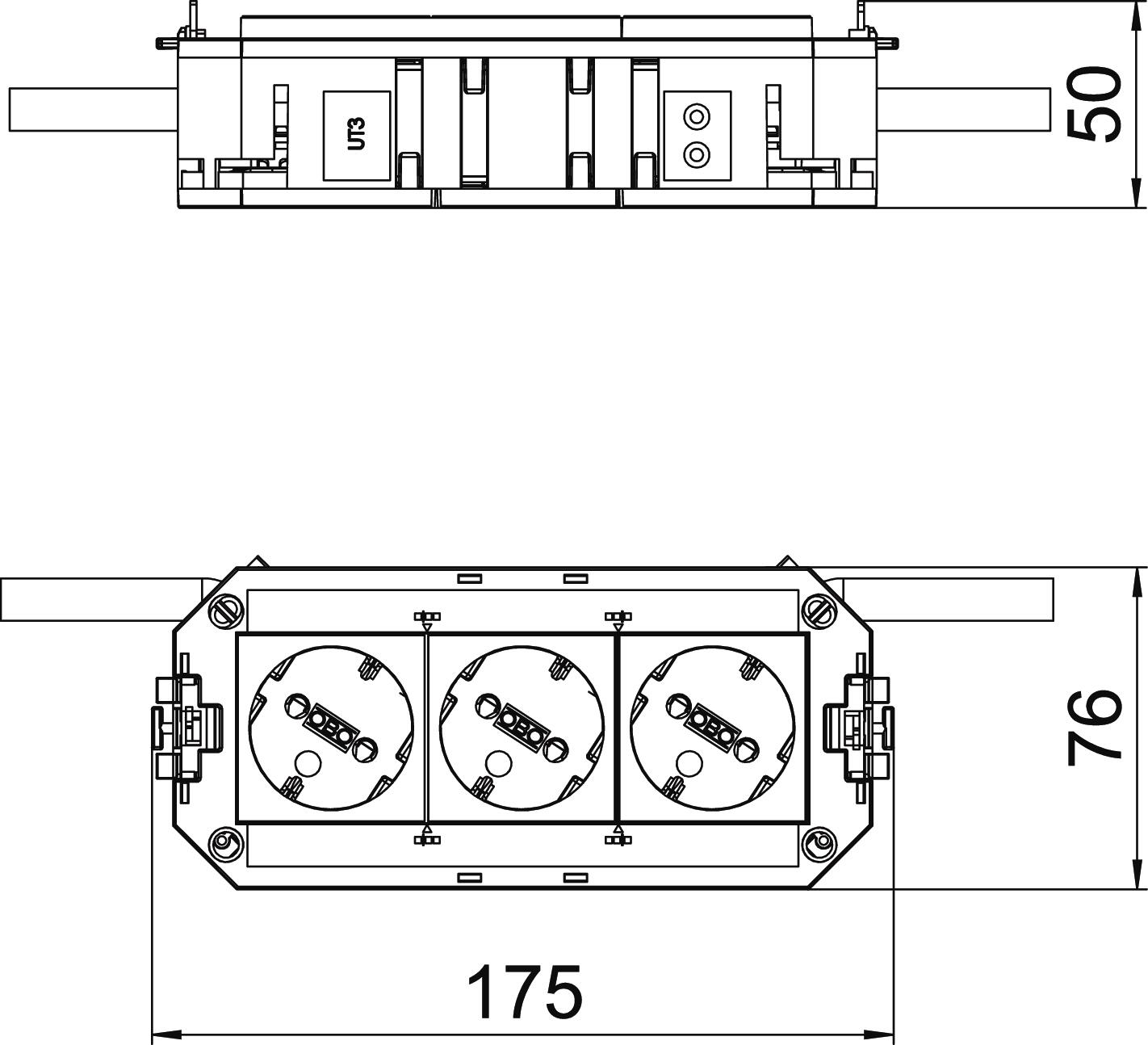 Укомплектованная монтажная коробка UTC3 оснащена 2 розетками 33° с заземляющим контактом белого цвета, 16 А, и одной розеткой 33° с защитным контактом оранжевого цвета, 16 A.