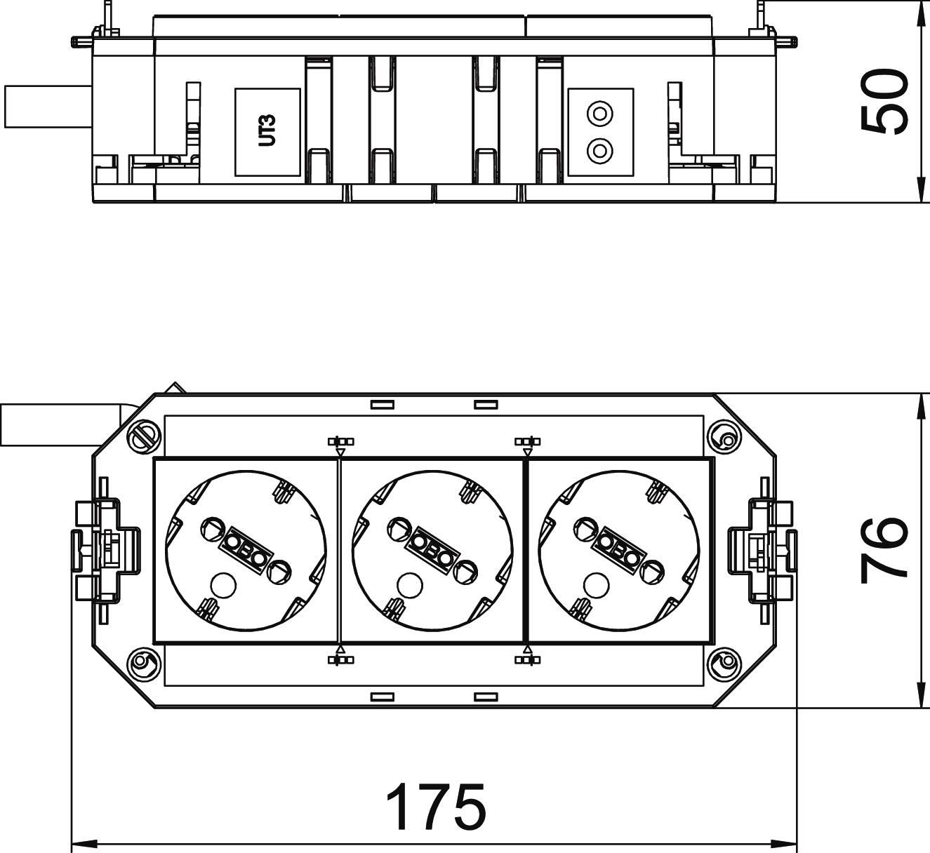 Укомплектованная монтажная коробка UTC3 оснащена 3 розетками 33° с заземляющим контактом белого цвета, 16 А.