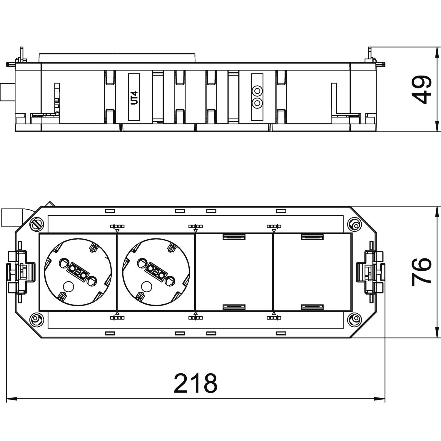Укомплектованная монтажная коробка UTC4 оснащена 2 розетками 33° с защитным контактом, 16 А, и 2 заглушками для последующей установки 2 электроустановочных устройств Modul45.