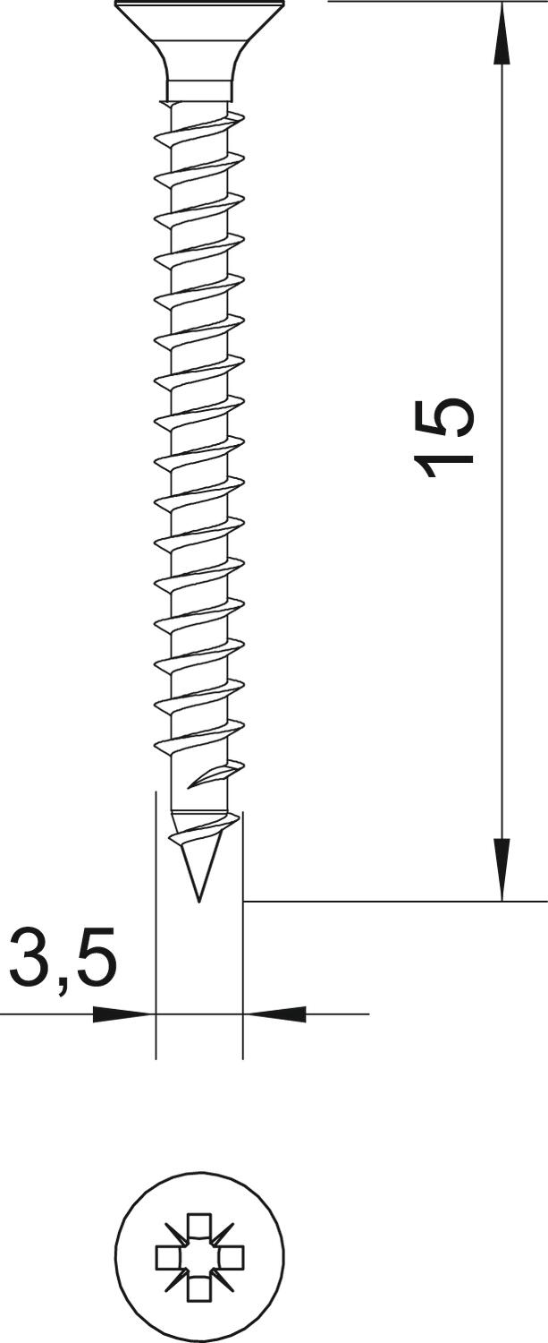 Винтовая система Pozidriv PZ Диаметр головки 6,5 mm Длина 15 mm Закаленная поверхность да Материал Сталь Поверхность гальванически оцинкованный Размер 3,5x15mm Размер D 3,5 mm Размер L 15 mm Форма головки Потайная головка - Все виды