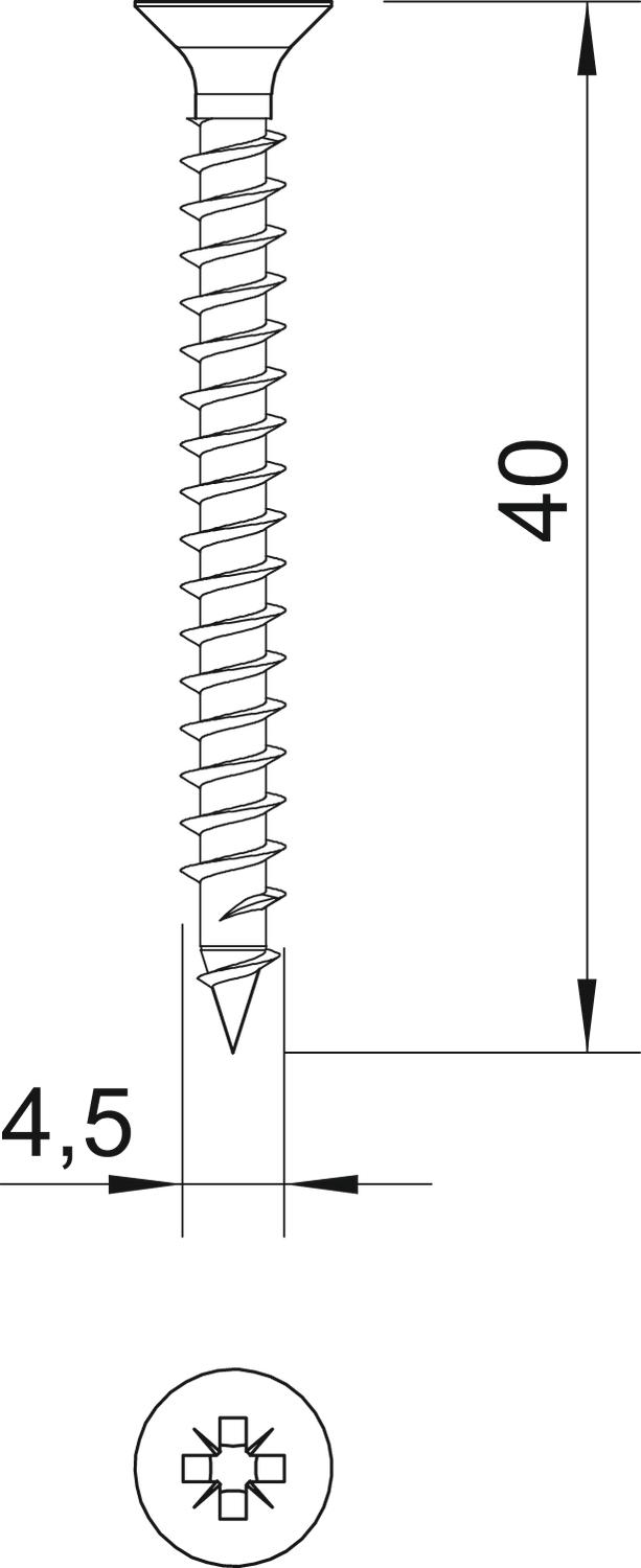Винтовая система Pozidriv PZ Диаметр головки 8,3 mm Длина 40 mm Закаленная поверхность да Материал Сталь Поверхность гальванически оцинкованный Размер 4,5x40mm Размер D 4,5 mm Размер L 40 mm Форма головки Потайная головка - Все виды