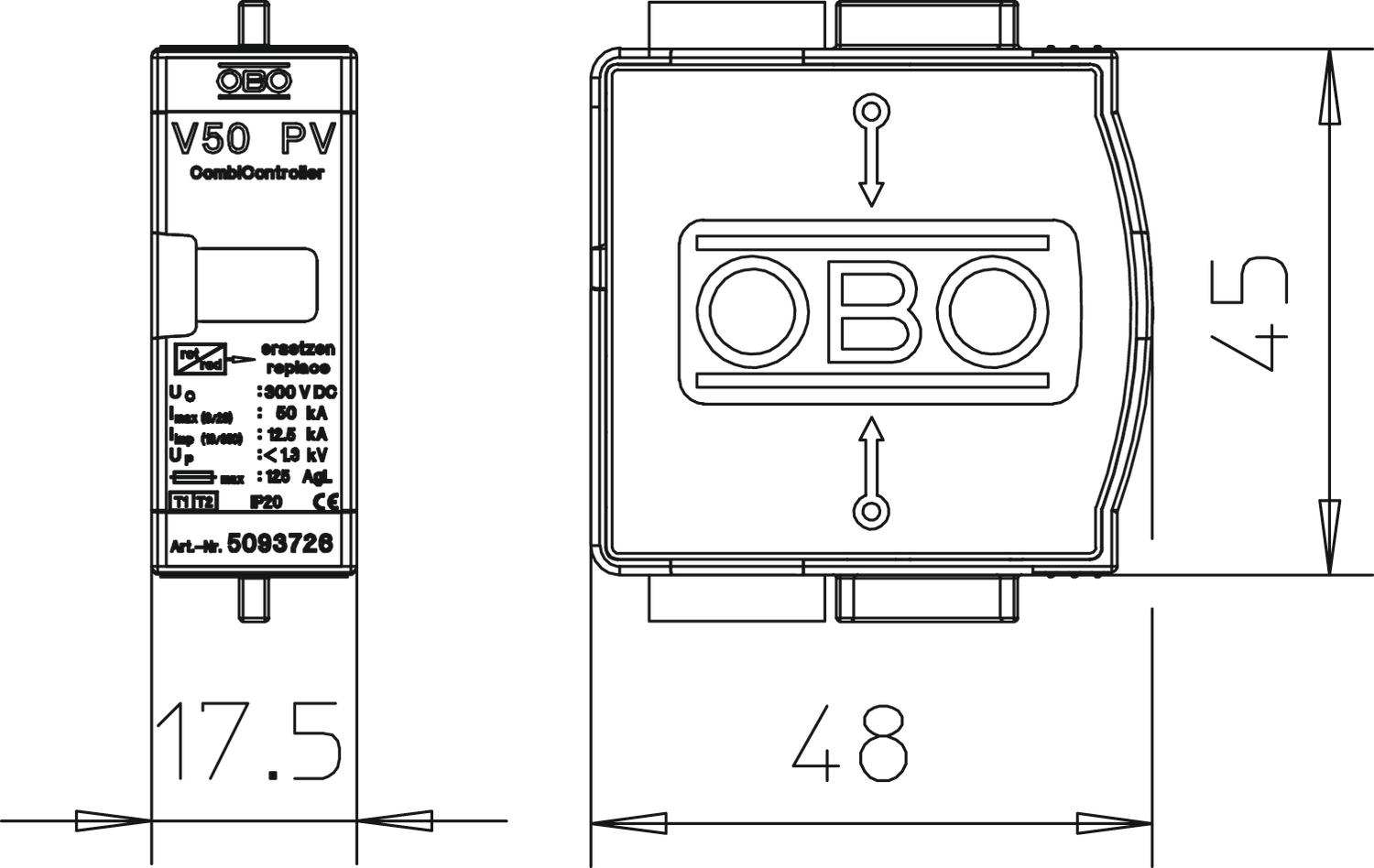Описание продуктаV 50-B+C/...PV: Вставка комбинированного разрядника- тип 1+2 для фотогальванических энергоустановок